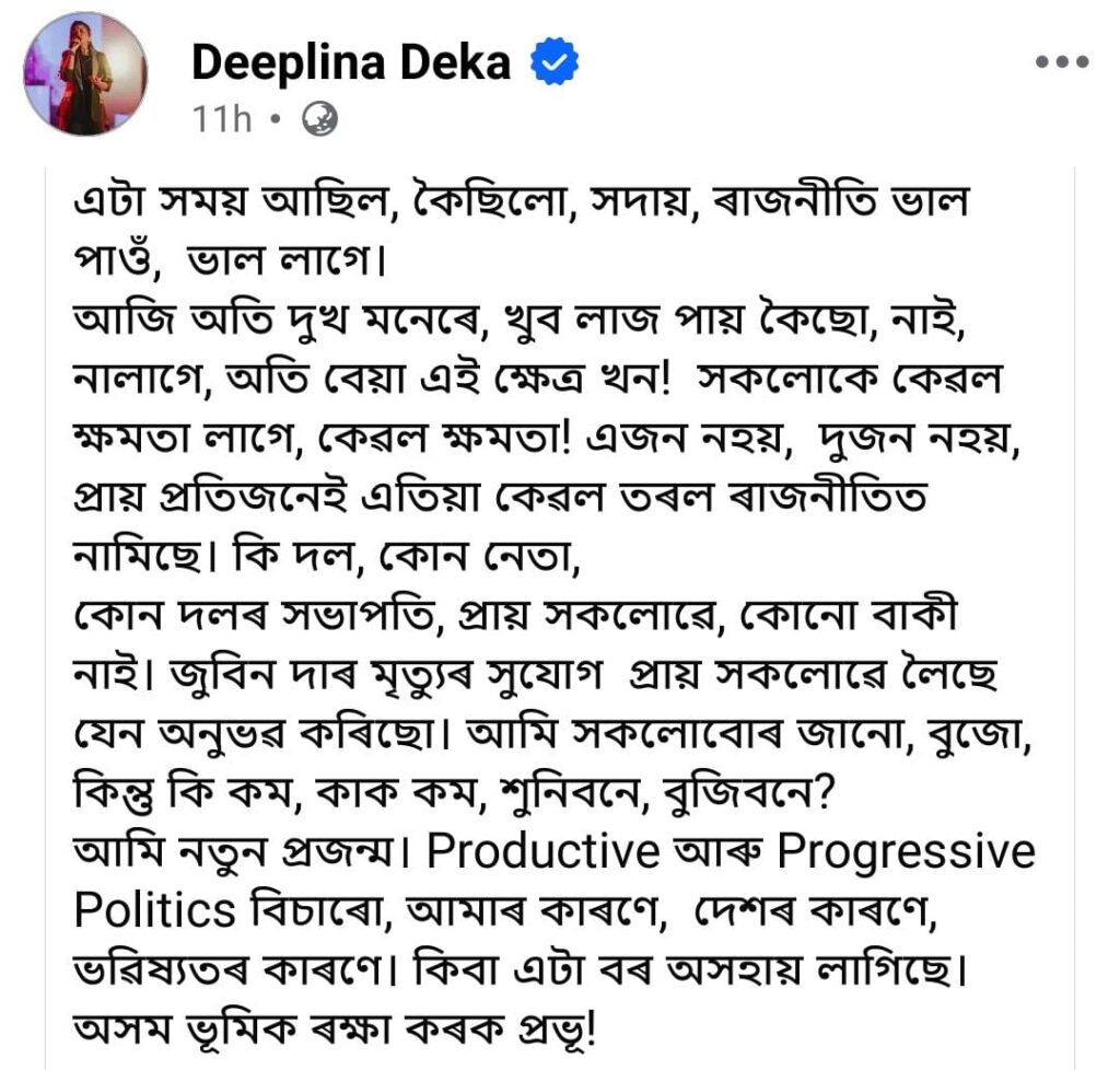 কিন্তু হঠাৎ সেই গৰাকী কণ্ঠশিল্পীৰে বেয়া লগা হ’ল ৰাজনীতি। সোমাবাৰে মাজনিশা তেওঁ সামাজিক মাধ্যমত শ্বেয়াৰ কৰে এটা পোষ্ট। কিয় আৰু কি কাৰণত তেওঁৰ ৰাজনীতিৰ প্ৰতি অনিহা জাগিল সেই কথা তেওঁ পাকে প্ৰকাৰে পোষ্টটোৰ যোগেদি বুজোৱাৰ চেষ্টা কৰিছে।