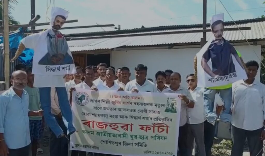 প্ৰতিকাত্মক ৰূপত ফাঁচী কাঠত ওলমালে শ্যামকানু-সিদ্ধাৰ্থক! ফাঁচী কাঠত ওলমাই ৰাইজে দিলে ‘জয় জুবিন দা’ শ্ল’গান!